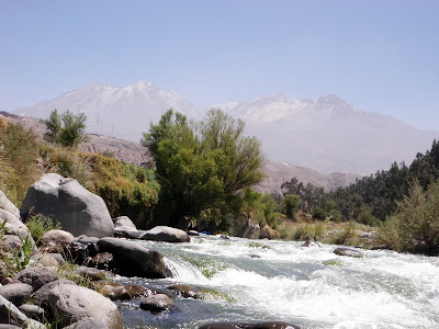 A paisagem durante a descida é linda e a imagem onipresente do vulcão Chachani é espetacular. No final, entre uma corredeira e outra, paramos para saltar de uma pedra.